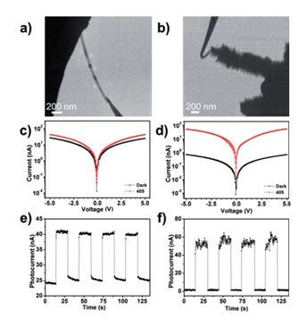 圖4:(a)(b)分別對(duì)應(yīng)CdS納米帶和CdS/ZnO異質(zhì)結(jié)安置在原位光學(xué)-光纖樣品桿中的TEM圖像。(c)(d)分別對(duì)應(yīng)CdS納米帶和CdS/ZnO異質(zhì)結(jié)I-V曲線(xiàn)的開(kāi)關(guān)特性。(e)(f)分別對(duì)應(yīng)CdS納米帶和CdS/ZnO異質(zhì)結(jié)對(duì)周期性光信號(hào)的響應(yīng)特性。