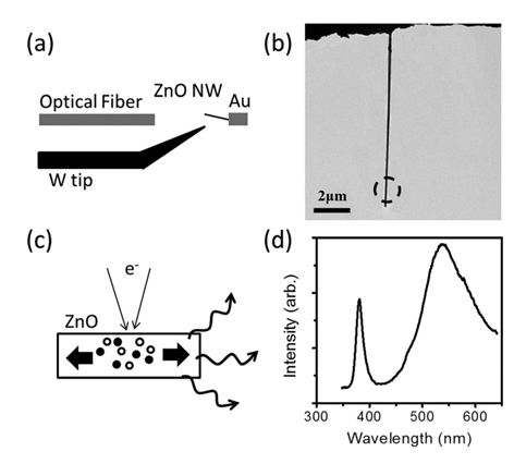圖1:(a) 原位透射電子顯微鏡光學-光電測量系統應用原理圖;(b) 單根ZnO納米線的TEM圖像,電子束被聚焦在納米線的末端。(c) 圖解ZnO納米線的發光機制; (d) 典型的CL譜。