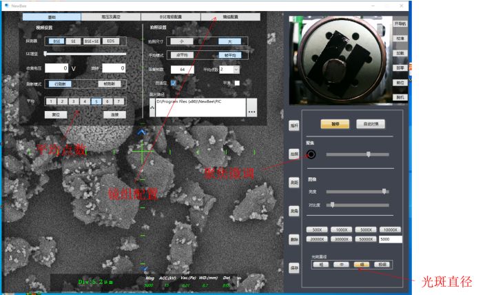 2、按照需要設定電壓值。并將"光斑直徑"調整至"粗"或者"中",勾選"自適應"按鈕,調整"亮度""對比度",至出現較為明亮的圖像。后粗調"聚焦"條,至顯示較為清晰的圖像,然后將樣品臺移動到想要拍照的樣品上。