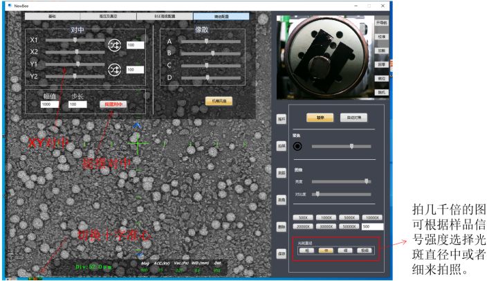 將光斑直徑保持為細,開啟十字準心,調焦至能看到所需拍攝的細節后,開啟搖擺對中,調節對中條,至準心與圖像相對位置同心縮放。而后調節像散至圖像至圖像清晰處(此步驟時可將基礎欄中視頻設置的平均點數調整為4,以便得到清晰圖像)。